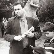 Зам. директора ПО «Север» Анатолий Соболев, его сын Алеша и динозавр в Новосибирском зоопарке