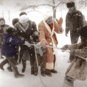 Ну а затейники здесь - экстракласс. Друзья парка столпились возле них в три круга и подбодряют их аплодисментами и возгласами «бис». Ликует детвора. Тут все почти как на новогодней елке. Дед Мороз. Снегурочка. Иван-дурак. Буквально пленил всех фокусник Дима Латышев. Несмотря на морозец, он выделывал чудеса с носовыми платками и веревками в черном смокинге, припорошенном серебристым снежком. Порхающих здесь летом с цветочка на цветочек мотыльков заменяла черная бабочка маэстро. Худрук парка Наталья Ивановна Аксенова режиссировала шоу, сама обрядившись в экзотические наряды сказочного персонажа. Уже и Деда Мороза встретили. И Кикимору изгнали. И поперетягивали канаты. И гирькой пудовой побаловались. Кстати, одним из призеров в конкурсе ловких и сильных стал профессиональный пожарный Сергей Стащак.