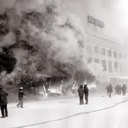 На пожарных было жалко смотреть - мокрые от воды и пота, с отмороженными скрючившимися пальцами, они пытались спасти некогда солидное здание центрального магазина. Не получилось. Из-за 40-градусной стужи зевак почти не наблюдалось. Только редкие прохожие в удивлении останавливались на несколько секунд и выдавали многозначительные реплики, состоявшие в основном из одних гласных.