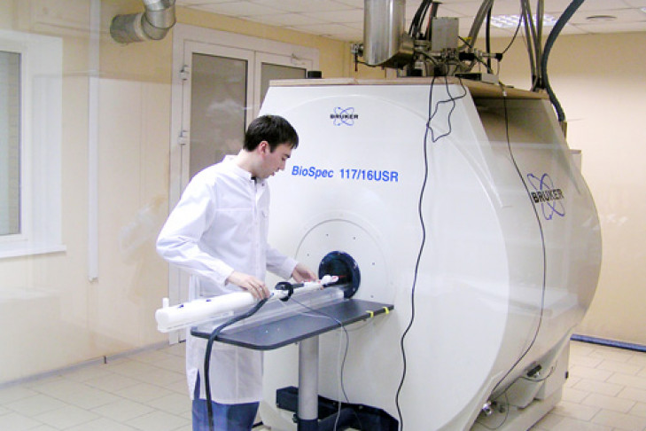 Хозяева охотно показывали приглашённым (в их числе были и журналисты) сияющие светом и чистотой лаборатории (оборудование ждёт своих пациентов). Вот одну мышку, наверное, специально для гостей, поместили в специальный магнитно-резонансный компьютер Biospec производства германской компании Bruker. На дисплее компьютера отчётливо видны все её внутренности, сокращающееся сердце. Советник РАН академик Владимир Шумный делает пояснения.