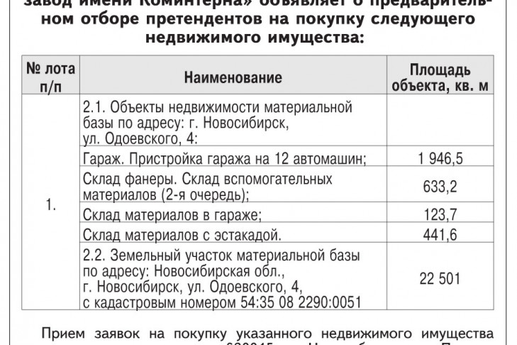 Открытое акционерное общество «НИИ измерительных приборов — Новосибирский завод имени Коминтерна» объявляет о предварительном отборе претендентов на покупку следующего недвижимого имущества:(Таблица 1)