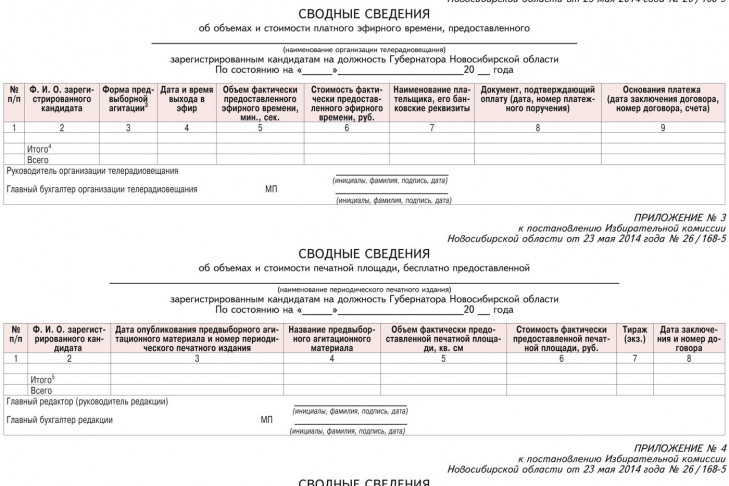 Постановление от 23 мая 2014 года № 26/168-5 \"О формах ведения организациями, осуществляющими выпуск средств массовой информации, отдельного учета объемов и стоимости бесплатного и платного эфирного времени и бесплатной и платной печатной площади, предоставленных зарегистрированным кандидатам для проведения предвыборной агитации при проведении выборов Губернатора Новосибирской области\"