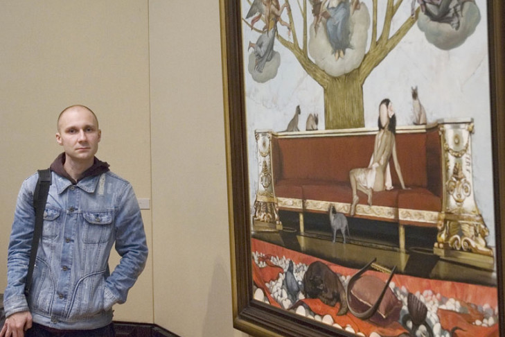 Максим Афанасьев на правах хозяина водил высоких гостей по выставочным залам, давал пояснения, знакомил с авторами.