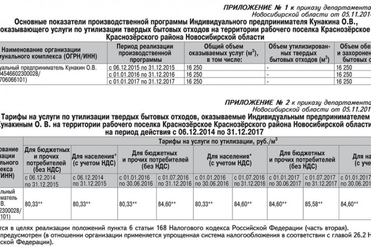 2. Установить тарифы на услуги по утилизации твердых бытовых отходов, оказываемые Индивидуальным предпринимателем Кунакиным О.В. на территории рабочего поселка Краснозёрское Краснозёрского района Новосибирской области, с календарной разбивкой согласно приложению № 2 (см. Таблицу 1).