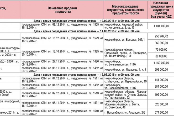 Срок приема заявок — с момента опубликования по 18.02.2015 г. (включительно) в рабочие дни с 10:00 до 16:00 по адресу: г. Новосибирск, ул. Мостовая, 3, этаж 2, кабинет № 2. Ознакомление с предметом торгов — ежедневно с момента опубликования сообщения самостоятельно.