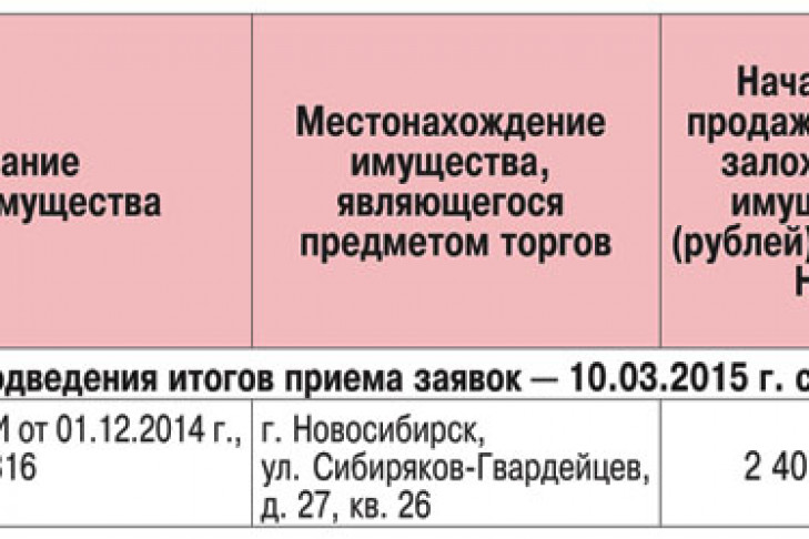 Организатор торгов — Территориальное управление Росимущества в Новосибирской области (г. Новосибирск, ул. Революции, 38, т. 223-28-54, 223-87-28) сообщает о проведении торгов в форме открытого аукциона по продаже арестованного (заложенного) имущества от 21.02.2015