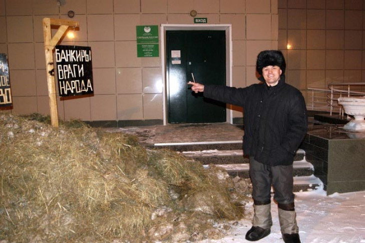 В феврале Александр Бакшаев высыпал телегу с навозом у одного из отделений Сбербанка в местном райцентре Куйбышев. Мужчина объяснил свою акцию чувством протеста против повышения кредитных ставок. По словам жителя Куйбышевского района, таким способом он заявил «против кредитного рабства», в котором оказались он и его коллеги — аграрии в новых финансово- экономических условиях.