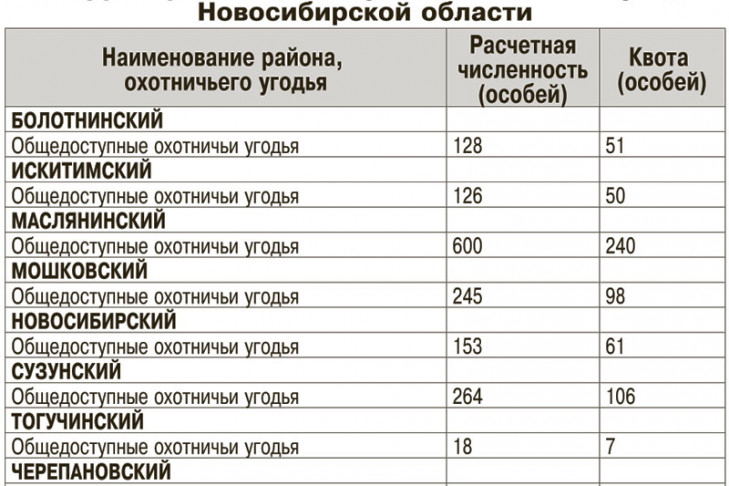 КВОТА добычи кабана на территории общедоступных охотничьих угодий Новосибирской области - см. Таблицу 1