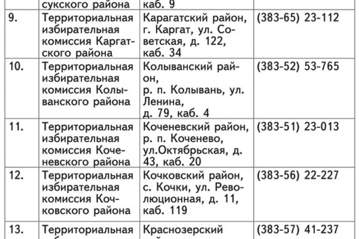 Прием документов осуществляется в период с 24 июля по 13 августа 2015 года в рабочие дни с 10:00 до 17:00 (обеденный перерыв с 13:00 до 14:00) территориальными избирательными комиссиями Новосибирской области. - см. Таблицы 1 и 2