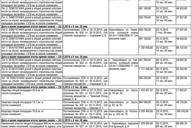 Порядок проведения аукциона. Торги начинаются с объявления минимальной начальной цены продажи объекта, которая повышается по мере выдвижения предложений в соответствии с шагом аукциона; выигравшим торги на аукционе (победителем торгов) признается лицо, предложившее наиболее высокую цену. Организатор торгов и победитель торгов подписывают протокол о результатах, имеющий силу договора, в день проведения торгов на основании оформленного решения комиссии об определении победителя торгов. Срок и порядок подписания протокола о результатах торгов, имеющего силу договора и договора купли-продажи имущества, установлены ст. 89 Закона «Об исполнительном производстве», ст. 57 Закона «Об ипотеке», ст. 350 ГК РФ. Обязательства по договору, заключенному на торгах должны быть исполнены победителем торгов лично, если иное не установлено в соответствии с законом. Лицо, уклонившееся от подписания протокола, обязано возместить причиненные этим убытки в части, превышающей размер предоставленного обеспечения. В случае неуплаты победителем торгов покупной цены в установленный срок договор с ним считается незаключенным, а торги признаются несостоявшимися, организатор торгов также вправе требовать возмещения причиненных ему убытков. Торги проводятся в соответствии со статьями 447–449.1 Гражданского кодекса Российской Федерации, Федеральным законом «Об ипотеке (залоге недвижимости)» от 16.07.1998 № 102-ФЗ, Федеральным законом «Об исполнительном производстве» от 02.10.2007 № 229-ФЗ. Аукцион, в котором принял участие только один участник, признается несостоявшимся в соответствии со ст. 350.2, 447 Гражданского кодекса Российской Федерации, Федеральным законом «Об ипотеке (залоге недвижимости)» от 16.07.1998 № 102-ФЗ, ФЗ «Об исполнительном производстве» от 02.10.2007 № 229-ФЗ. Подать заявку, получить дополнительную информацию об объектах и порядке проведения аукциона, а также ознакомиться с приложенными к заявке документами можно по адресу организатора торгов. Регламент организации и проведения торгов по продаже арестованного имущества размещен на сайте Территориального управления Росимущества в Новосибирской области: www.tu54.rosim.ru. Информация о торгах размещена на официальном сайте РФ: http://torgi.gov.ru, www.tu54.rosim.ru.