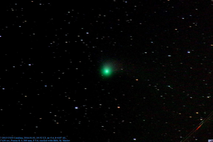 Специалист обсерватории «Вега» Михаил Маслов сделал фото Каталины 9 января. Фото было сделано при неблагоприятных погодных условиях, комета находилась на уровне 15° над горизонтом, который был засвечен восходящей Луной.