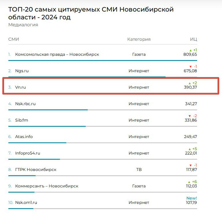 VN.ru входит в топ-20 самых цитируемых СМИ Новосибирской области, по данным «Медиалогии».